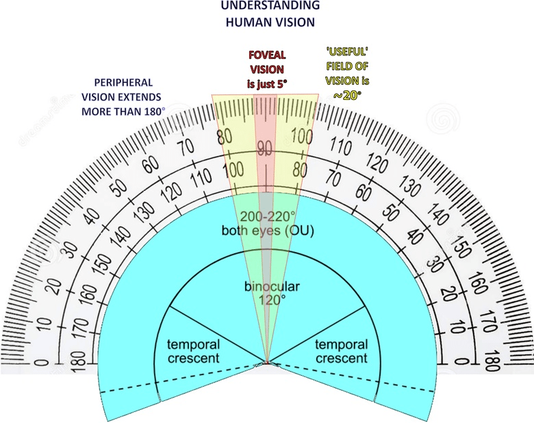 ‘USEFUL’ AND FOCUSED VISION IS MORE RESTRICTED – Within that binocular field, the so-called ‘useful’ field of vision – the visual area from which information can be extracted in a single glance without eye or head movements – is restricted to around 10° either side of our line of sight.