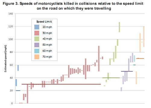 I don’t think it’s any coincidence that in a study of fatal bike crashes in the London area a few years ago, the majority of the deaths in the lower speed limits involved riders who were exceeding the limit. The horizontal lines in the chart represent the speed limit. The vertical bars are the estimated speeds of the riders who died.